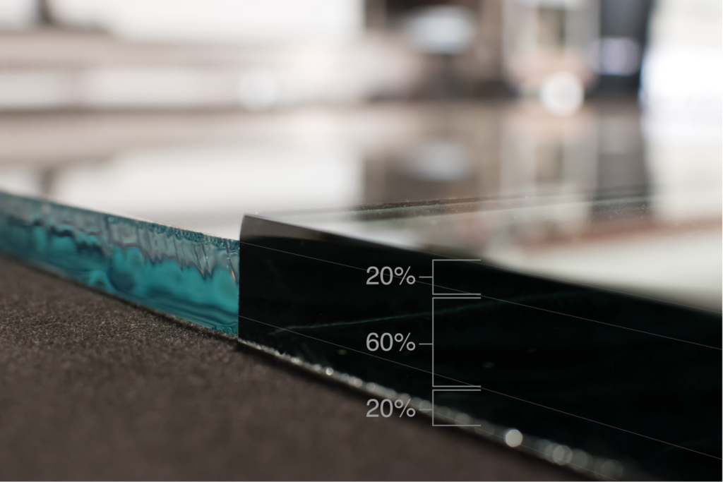 Bei dickeren Gläsern ist zudem ein zusätzlicher Rand von mehreren Millimetern erforderlich, um es später zu polieren und die gewünschte Maßnahme zu erreichen. Zum Beispiel würde bei einem Glas von 15 oder 19 Millimetern ein Rand von 3 oder 4 Millimetern hinterlassen werden. Die Kosten für das Polieren dieser Glasmenge sind sehr hoch, daher ist diese Lösung kostspielig und ineffizient in der Produktion“, fügt Miguel Ángel Guillén, Direktor für F&E bei TUROMAS, hinzu.