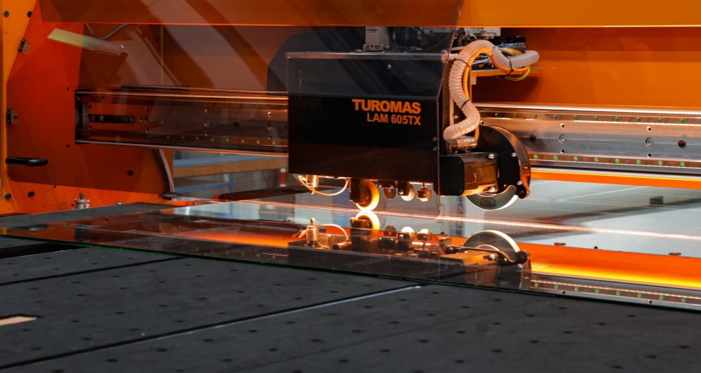 Mit einer Nutzlänge von 6.000 mm integriert die LAM 600 (Im Abschnitt [TUROMAS auf der VITRUM 2025]) das neue Brech- und Trennsystem von TUROMAS, das den Zyklus jedes Schnitts um 10 Sekunden verkürzt und das Arbeiten mit leicht erwärmtem Butyral ermöglicht, was die Hochwertigkeit des Endergebnisses optimiert. Zudem automatisieren der Messwagen zusammen mit dem Ladetisch mit MCC-Riemen in einer einzigen Linie die Vorgänge des Ladens, Positionierens, Schneidens und Evakuierens von Verbundglas.