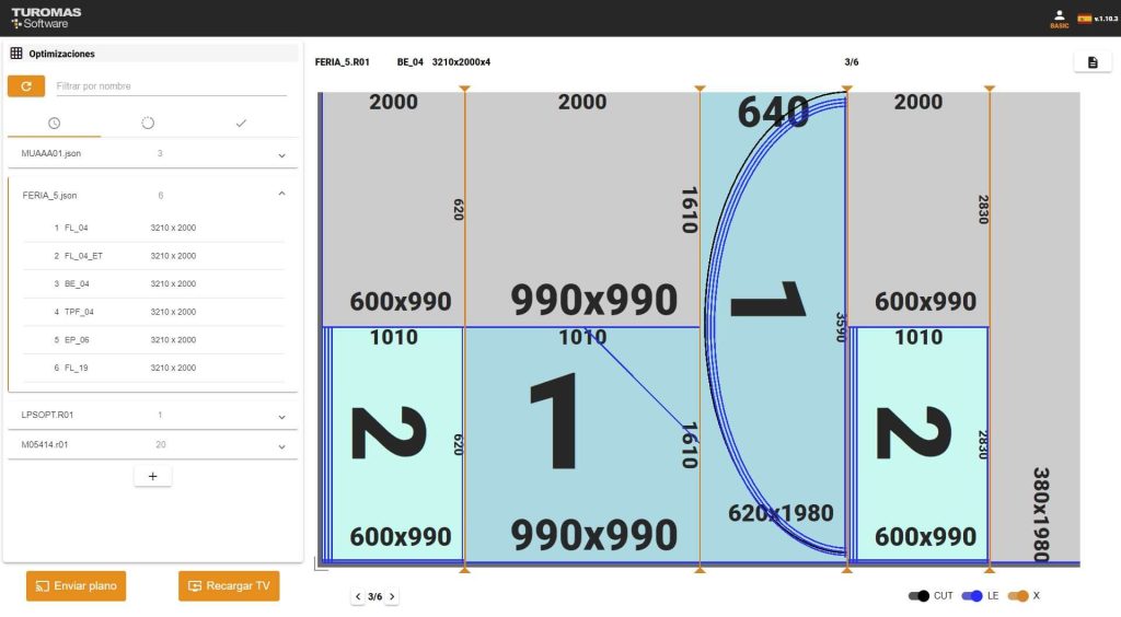 Cutting TV ist eine Anwendung von TUROMAS, die die automatische Visualisierung von Optimierungen ermöglicht. Auf einen Blick erhält der Bediener alle notwendigen Informationen für den Brechprozess: Sobald der Schneidetisch das Teil abtransportiert hat, wechselt die Anzeige automatisch, ohne dass ein Knopf oder Pedal betätigt werden muss.