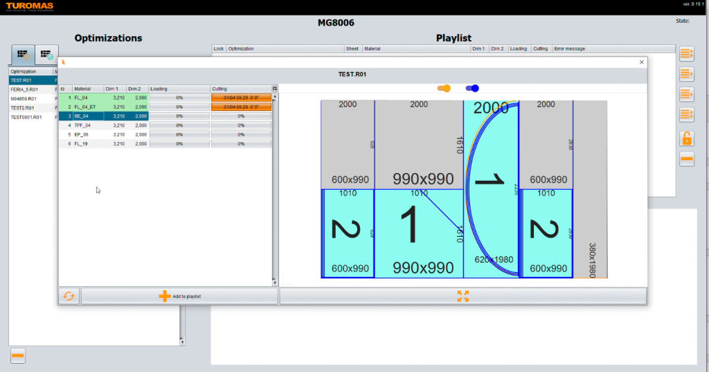 Die Anwendung importiert die Produktionsplanungsdaten aus der Optimierungssoftware. Basierend auf den vom Produktionsleiter festgelegten Parametern organisiert und koordiniert sie automatisch die Befehle für die Lager- und Schneidemaschinen im Werk und überwacht deren Ausführung in Echtzeit.
