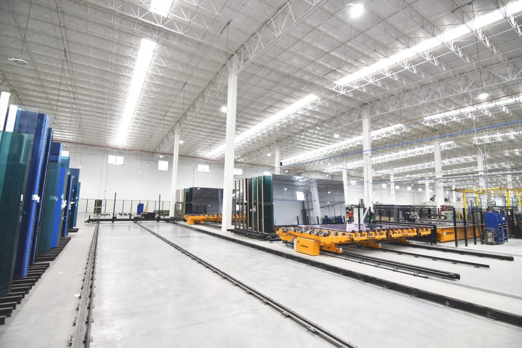 Para alimentar as linhas de corte, foi instalado um armazém inteligente SR-07 tipo rack shuttle com 39 posições e capacidade de armazenamento até 624 toneladas de vidro, incluindo uma posição externa de recarga que permite abastecer o sistema sem interromper o ciclo de produção.