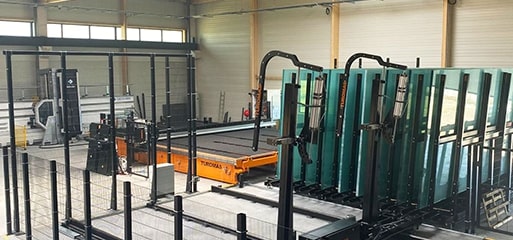 Os armazéns automáticos SR são ideais para aproveitar espaços de praticamente qualquer forma e tamanho. O armazém SR transporta os cavaletes completos, colocando-os ao lado das mesas de corte com carga automática ou dos carregadores automáticos. Juntamente com uma mesa de corte com ventosas, formam uma via simples e de baixo custo para obter armazenamento, carga e corte automatizados e de alto rendimento.