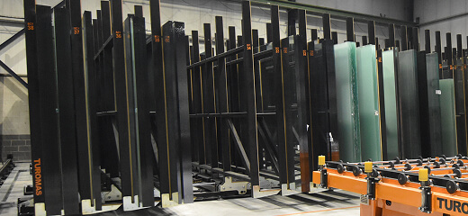 Sistema de almacenaje tipo archivador con apertura semiautomática mediante un mando manual que activa un sistema hidráulico. Su diseño modular permite ajustar las bases de apoyo entre 200 y 400 mm y admite vidrio de hasta 3700 x 2600 mm. La apertura asistida facilita la manipulación, reduce el esfuerzo del operario y protege el material gracias a movimientos suaves y seguros.
