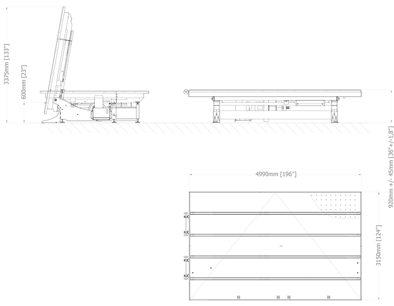 | MC-500 | 5.320 x 3.840 mm (209,4" x 151,2") | 2.600 kg (5.732 lb) | 7 kW | Basculante | 3 | 920mm +/- 45mm (36,6" +/- 1,8") |